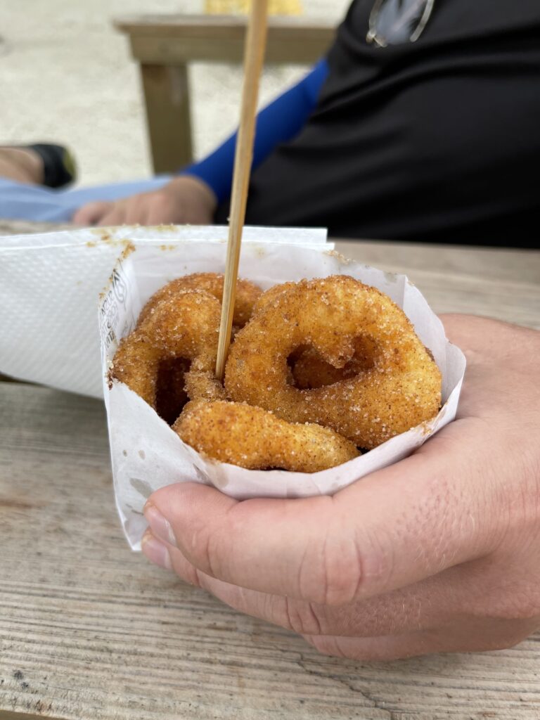 Our first stop was a little place called Ice and Beans, known for their coffee and fresh donuts. We stopped in, ordered some breakfast, and sat down on the chairs overlooking the beach. There are beach chairs, hammocks, picnic tables, and a bar out back where you can hang-out, relax, and enjoy your meal.